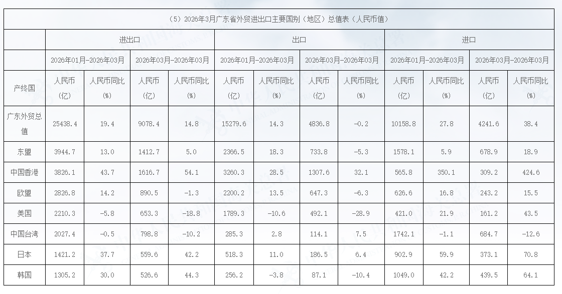 2026年3月广东省外贸进出口主要国别(地区)总值表(人民币值)